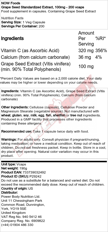 NOW FOODS GRAPE SEED STANDARDIZED EXTRACT, 100MG - 200 VCAPS