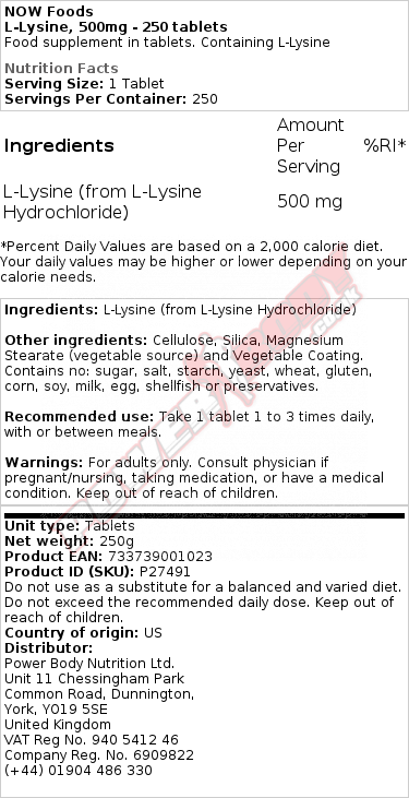 NOW FOODS L-LYSINE, 500MG - 250 TABLETS