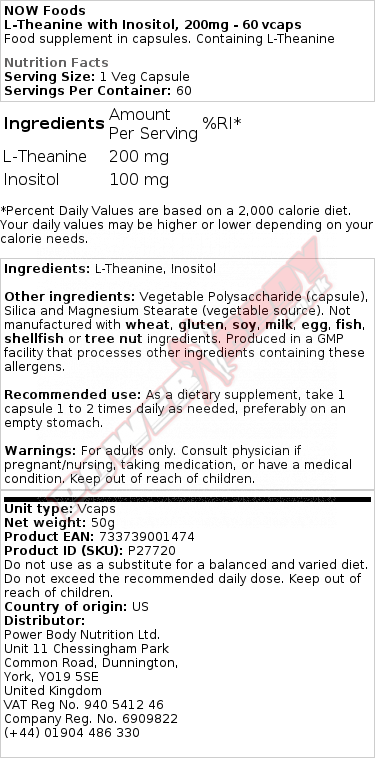 NOW FOODS L-THEANINE WITH INOSITOL, 200MG - 60 VCAPS
