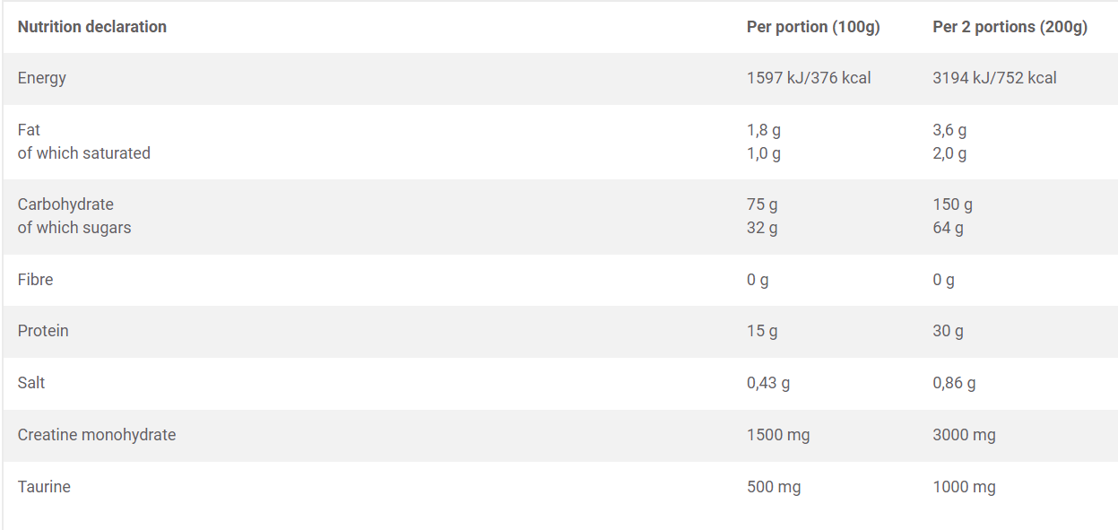 Användning: 1-2 portioner dagligen - Mellan måltiderna eller 1 timme före träning och senast 1 timme efter träning. 1 portion 100g = 2 scoops (medföljer) löses upp i 250 ml vatten eller mjölk.