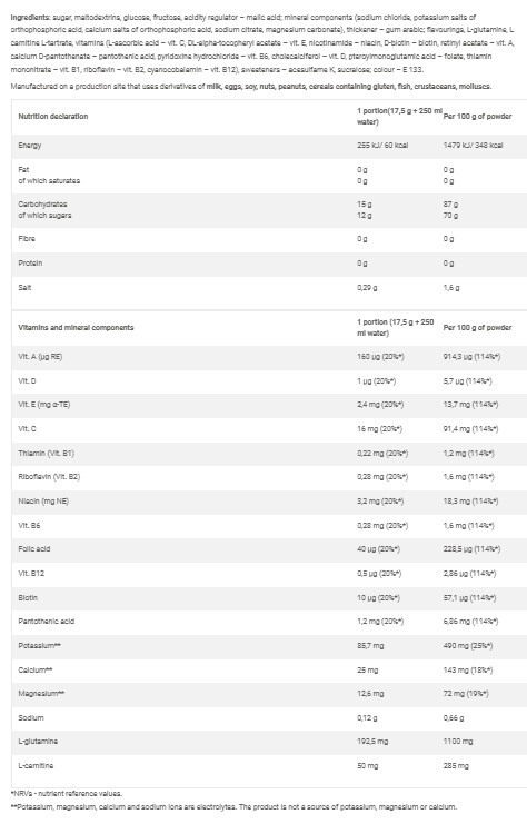 Användning: Blanda 17,5 g pulver = 1 ½ skopa i 250 ml vatten. Använd vid behov, särskilt under tävlingar, intensiv träning och krävande fysisk aktivitet. Ska drickas direkt efter blandning. Rekommenderad daglig dos bör inte överskridas. Kosttillskott bör aldrig ersätta en varierad kost. Vi rekommenderar en balanserad kost och en hälsosam livsstil. Förvaras i rumstemperatur.