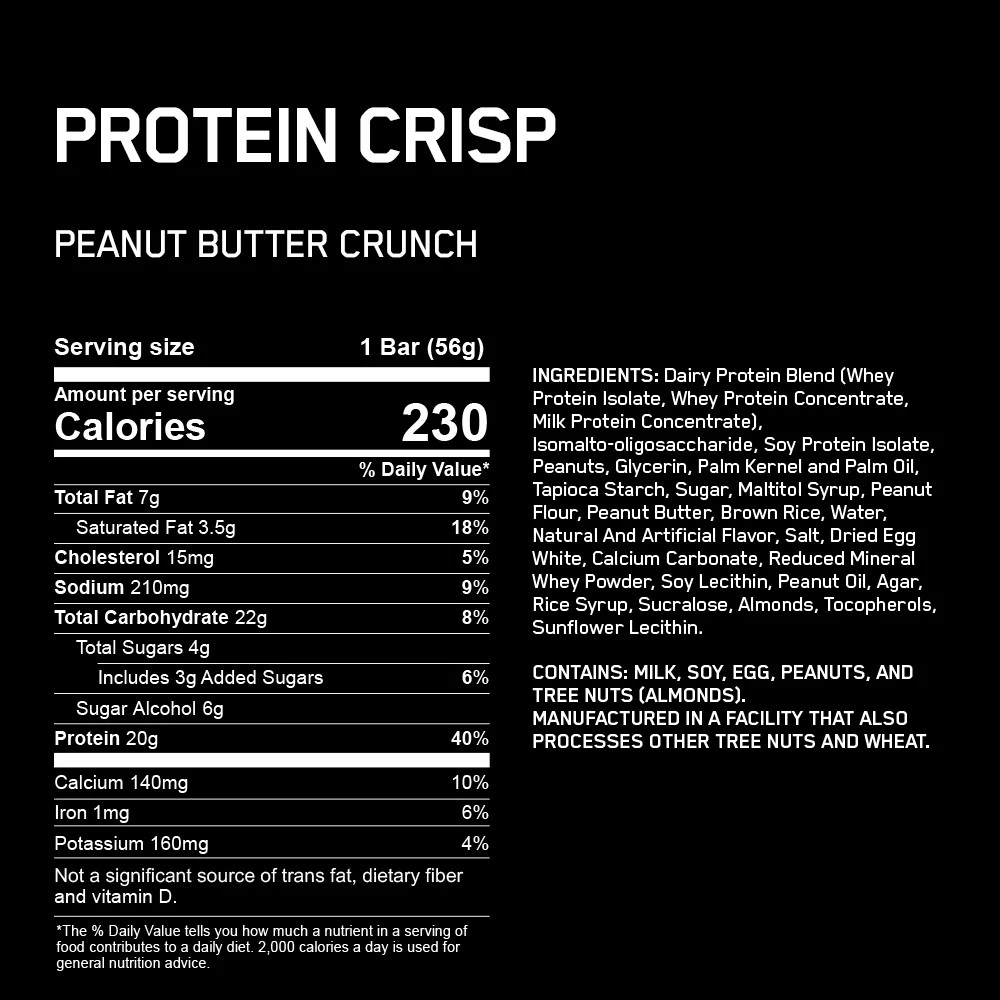 Denna nya läckra Optimum Nutrition Protein Crisp Bar är en läcker och proteinrik snack, som du alltid kan njuta av med gott samvete mellan måltider och på språng. Barerna har en otroligt god smak, och är samtidigt med en otroligt låg halt av socker och kolhydrater, med under 4 g socker per bar.