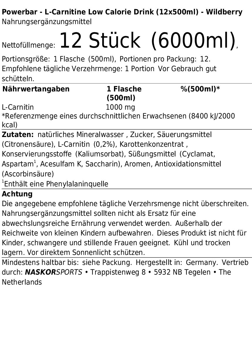 POWERBAR L-CARNITINE LOW CALORIE DRINK (12X500ML) WILDBERRY