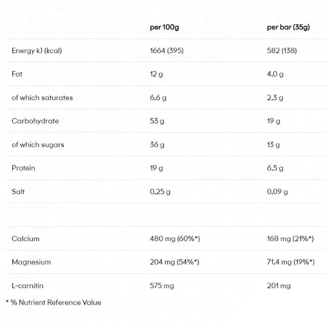 Ingredients (EN): Glucose syrup, white chocolate (20%) [sugar, cocoa butter, whole MILK powder, emulsifier (lecithins (SOY)), flavouring], whole MILK powder, MILK proteins (10%), invert sugar syrup, fruit preparation [sugar, raspberry and cherry juice from concentrate, raspberry puree (1%), fructose syrup, apple puree, lactose (MILK), palm kernel fat, natural flavouring, gelling agent (pectins), antioxidant (ascorbic acid)], marzipan [sugar, ALMONDS, water, humectant (sorbitol, invertase), invert sugar syrup, glucose syrup], whey protein (MILK) (4%), oligofructose, humectant (glycerol), sweet whey powder (MILK), L-carnitine-L-tartrate, magnesium carbonate, pea protein (0,5%), calcium carbonate, acid (citric acid), flavouring.