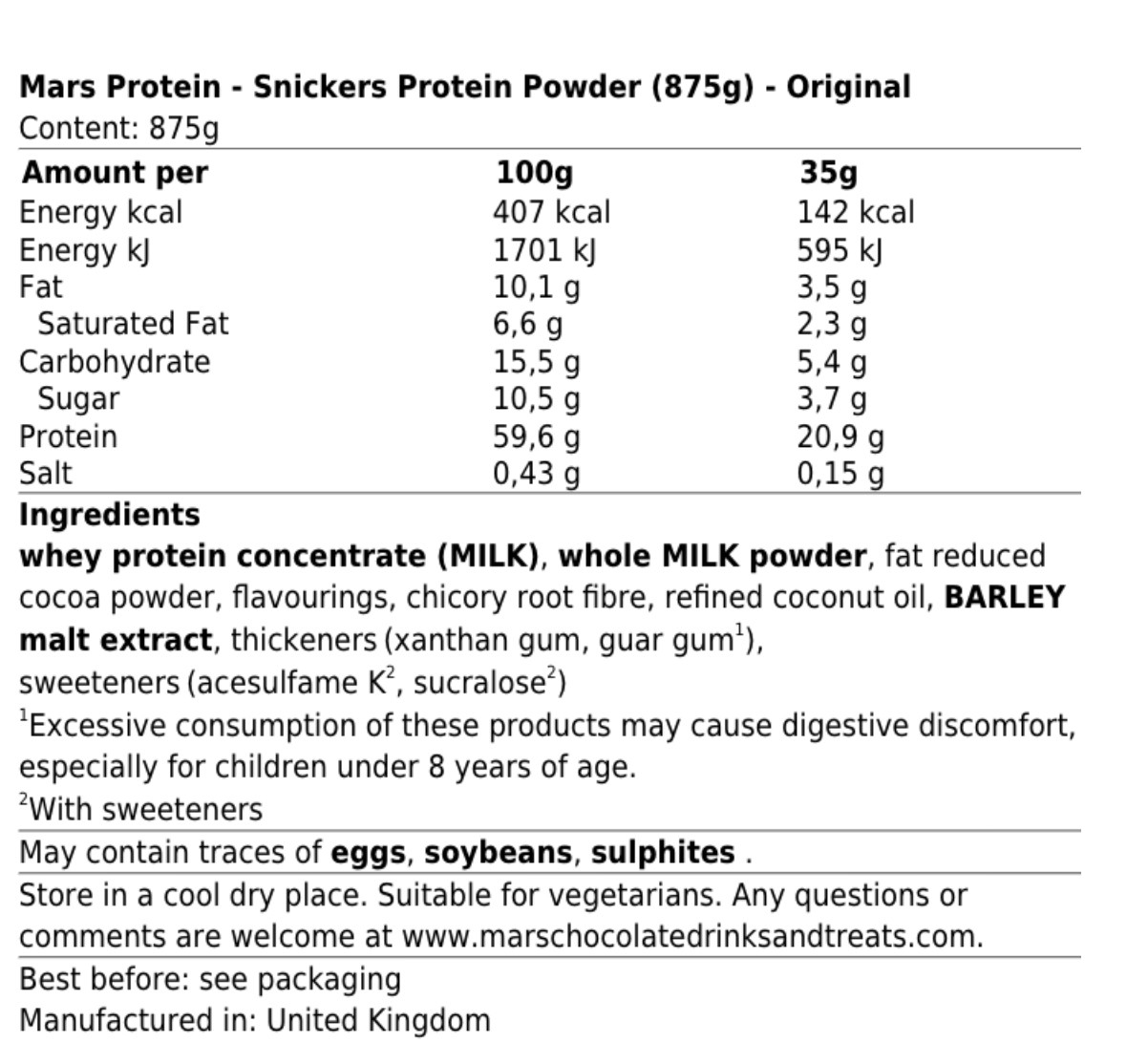 Vi är spända på att kunna presentera det nya Snickers proteinpulver. Snickers Hi-Protein ger dig i varje servering hela 20,9 g protein från vassleprotein koncentrat. Det är därmed enbart en bra och snabbt absorberbar proteinkälla i produkten. Du får dessutom naturligt förekommande BCAA aminosyror i varje servering. Proteinpulvret innehåller endast 141 kalorier per servering och har en låg halt av fett och kolhydrater.