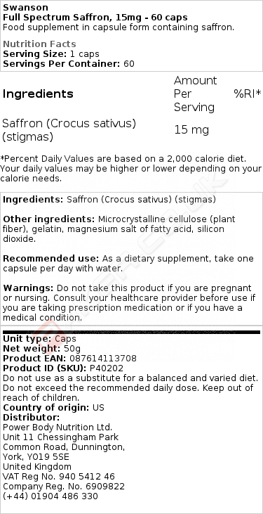 SWANSON FULL SPECTRUM SAFRAN, 15MG - 60 KAPSLAR