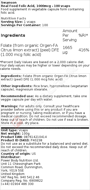 SWANSON REAL FOOD FOLIC ACID, 1000MCG - 100 VCAPS