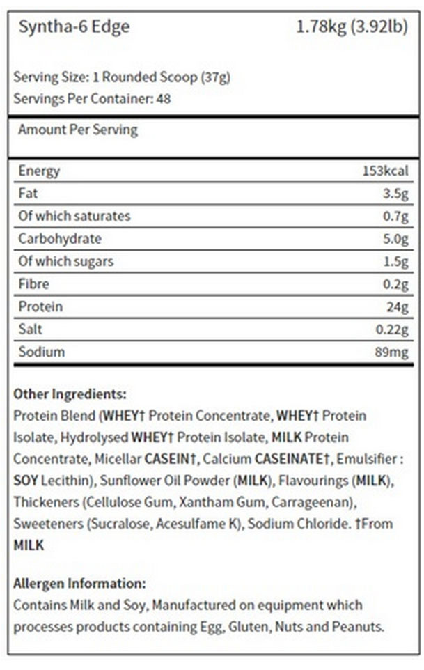 I varje skopa får du 24 g protein som kommer att ge näring åt dina muskler i upp till 8 timmar. Dessutom har Syntha-6 Edge ett lågt innehåll av kolhydrater och fett.