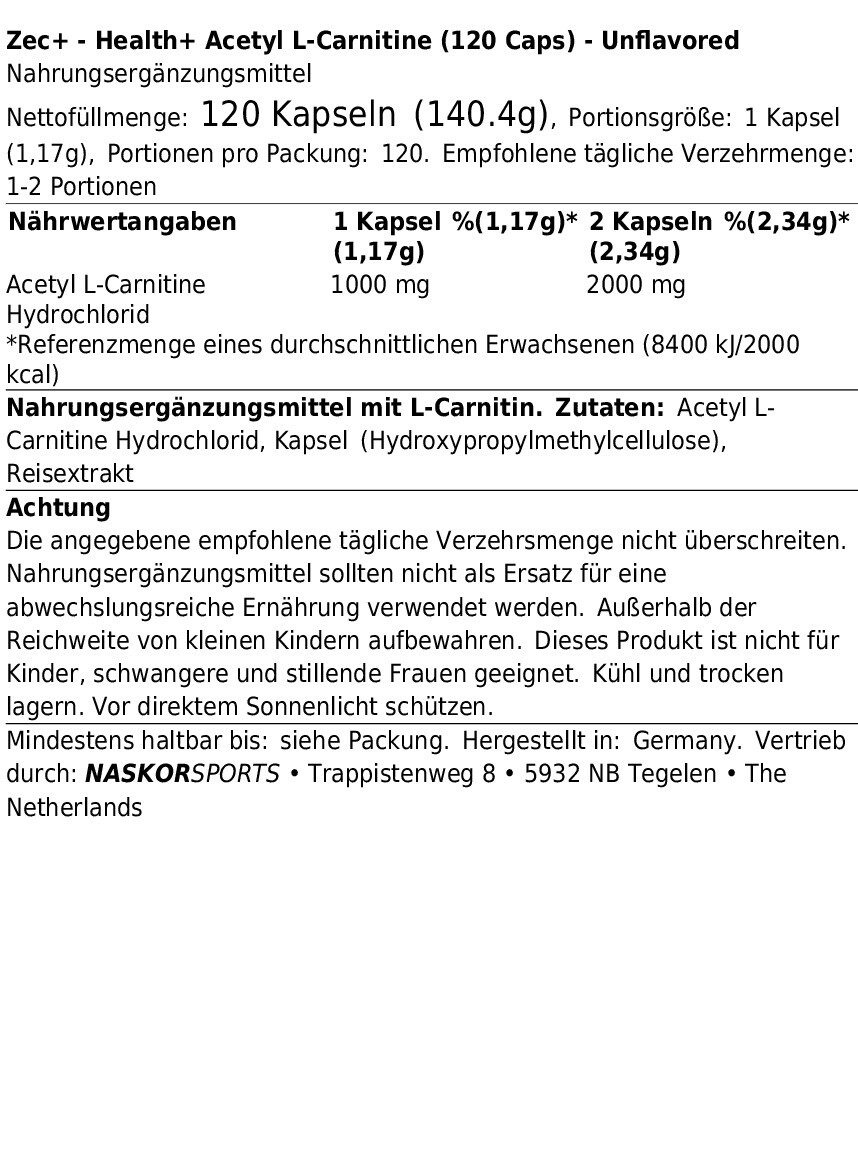 ZEC+ HEALTH+ ACETYL L-CARNITINE (120 CAPS) UNFLAVORED