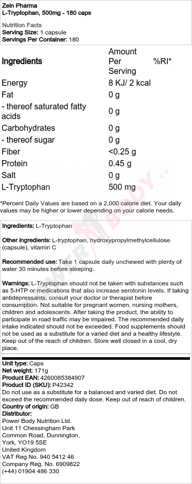 ZEIN L-TRYPTOPHAN, 500MG - 180 KAPSLAR