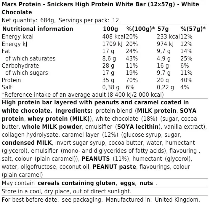 Er du på udkig efter en lækker og nærende proteinbar? Så led ikke længere! Snickers High Protein White bar smager som en snickers-drøm.