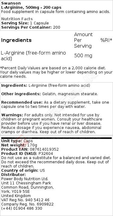 Portionsstørrelse: 1 kapsel200 portioner per beholder500 mg L-arginin per portion
