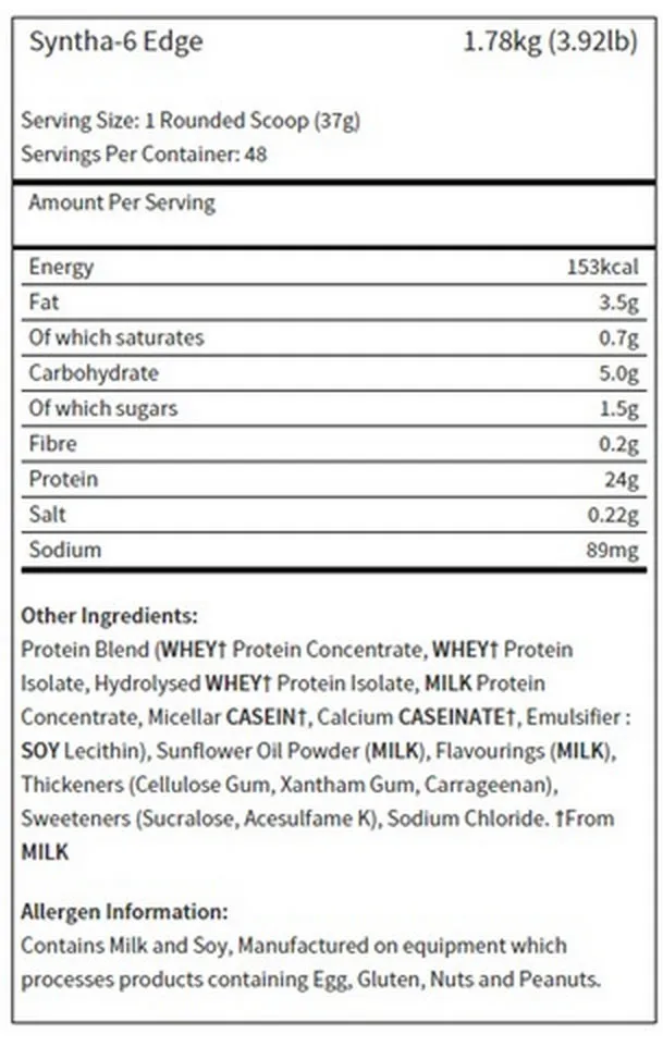 I hvert scoop får du 24 g protein som vil fodre dine muskler med næring i op til 8 timer. Desuden har Syntha-6 Edge et lavt indhold af kulhydrater og fedt.