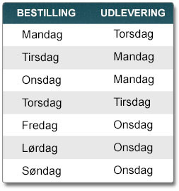 På skemaet kan du se hvornår du kan forvente at modtage din pakke, hvis du har bestilt transport. Der går normalt 3 hverdage før transportøren sender dig dit pakkenummer på e-mail. |