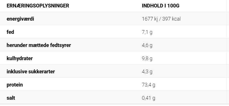 Valleproteinkoncentrat (fra mælk) 98%, kakao 1% (chokoladesmag), instant kaffe 1% (kaffesmag), aromaer, vaniljepulver 0,1% (vaniljesmag), jordbærjuicepulver 0,1% (smag jordbær), tørret banan puré 0,1% (banan smag), surhedsregulerende middel - citronsyre (smag: jordbær, fersken), farvestoffer: karmin (jordbær smag), carotener (smag: fersken, fudge og saltet karamel), ammoniak karamel - sulfit (smag: chokolade, kaffe, fudge og saltet karamel), fortykningsmiddel - xanthangummi, sødestoffer: sucralose og acesulfam K, salt (saltet karamelsmag).